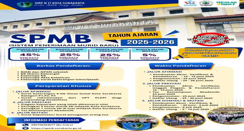 Didirikan dengan semangat mencerdaskan kehidupan bangsa, SMP Negeri 17 Surakarta terus berkembang menjadi sekolah unggulan dengan berbagai prestasi akademik maupun non-akademik.